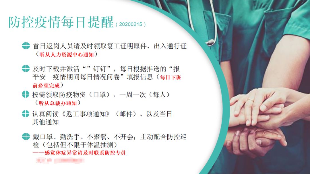 除了符合屬地政府針對復工“六到位”要求,和仁科技進一步細化各項工作,例如:安排疫情防控專員,進行防控物資統(tǒng)一分配登記、日常防控巡檢等,同時還通過公司職場各入口電視大屏,進行“防控疫情每日提醒”等關(guān)鍵措施、注意事項提醒等。