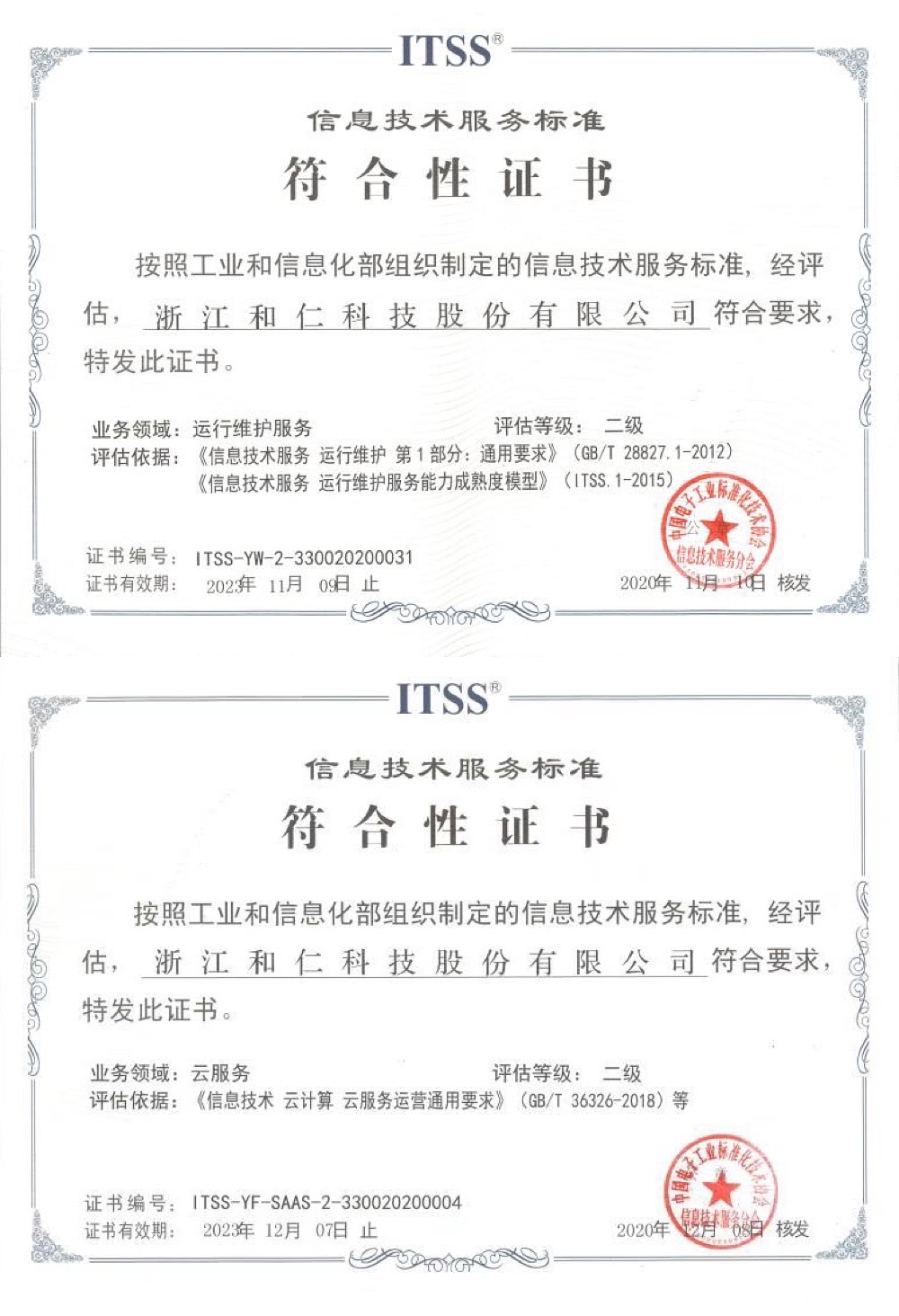 近日,浙江和仁科技股份有限公司(以下簡稱“和仁科技”或“公司”)組織申報的“信息技術服務標準”經過資格審查、專家評審、現場答辯,最終通過核查程序,先后取得了“信息技術服務標準符合性”運行維護服務二級、云服務二級符合性證書。