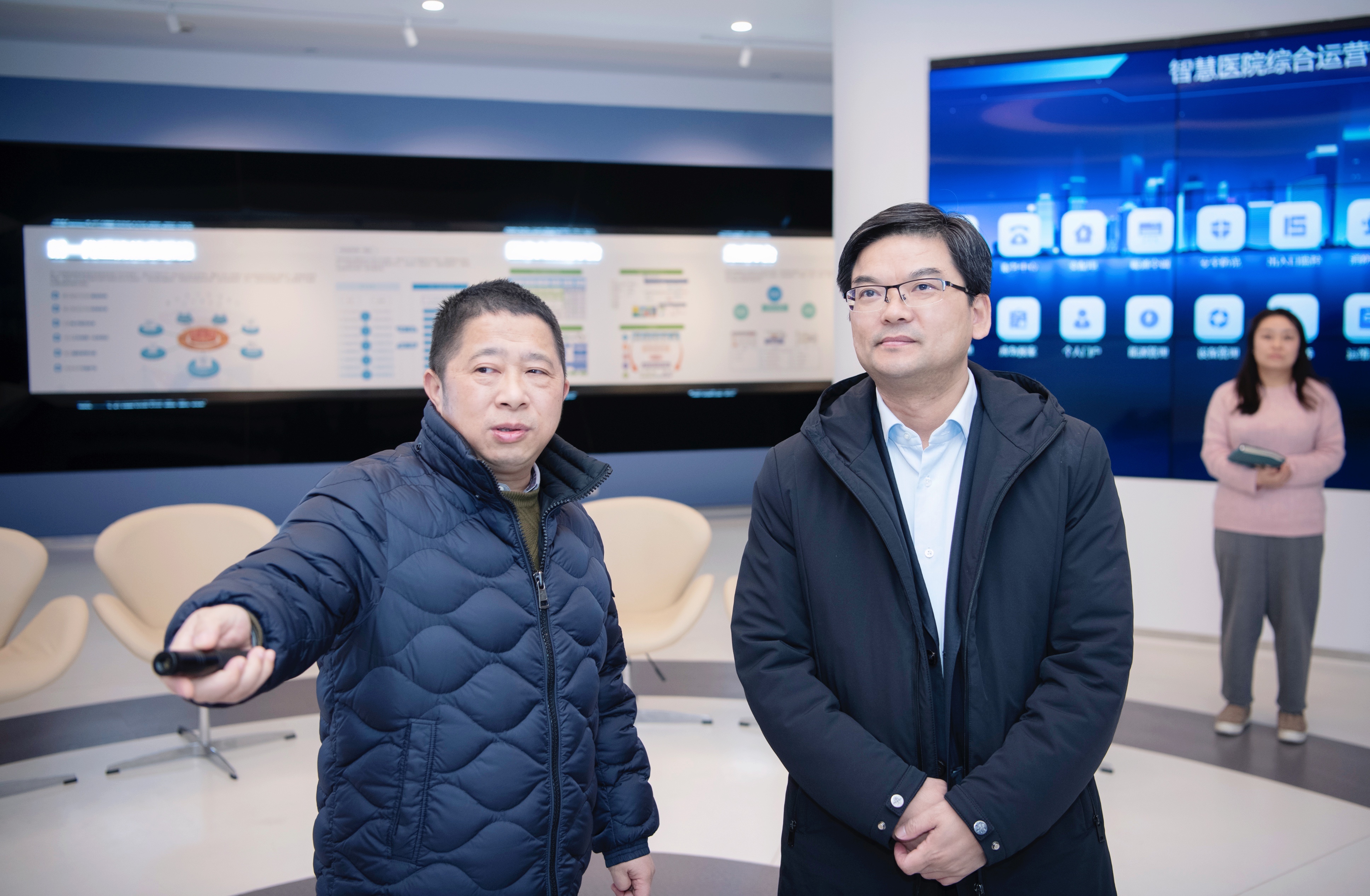 李志龍區長一行參觀了和仁科技智慧醫療展廳,聽取了企業的發展歷程、戰略規劃及企業在智慧醫療領域取得的成績,了解了“城市大腦·舒心就醫”的主要功能、實際效果等。